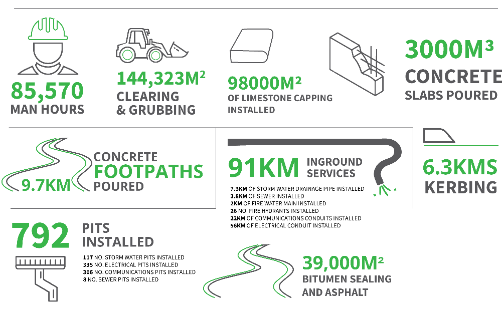 Monford Group were heavily involved in delivering the infrastructure around Perth’s premier sporting precinct. Monford’s work was separated into three parcels: the Camfield Drive road project, the new railway layby area and the Stadium Station Complex. The Camfield Drive road project involved the construction of a new road network connecting Victoria Park Drive to the Perth Stadium Bus Hub, and the extension of Camfield Drive from the Crown Casino to the Perth Stadium Bus Hub, including a new alignment of the principal shared path in the area. The new road construction was designed to cross an interconnecting lake network.